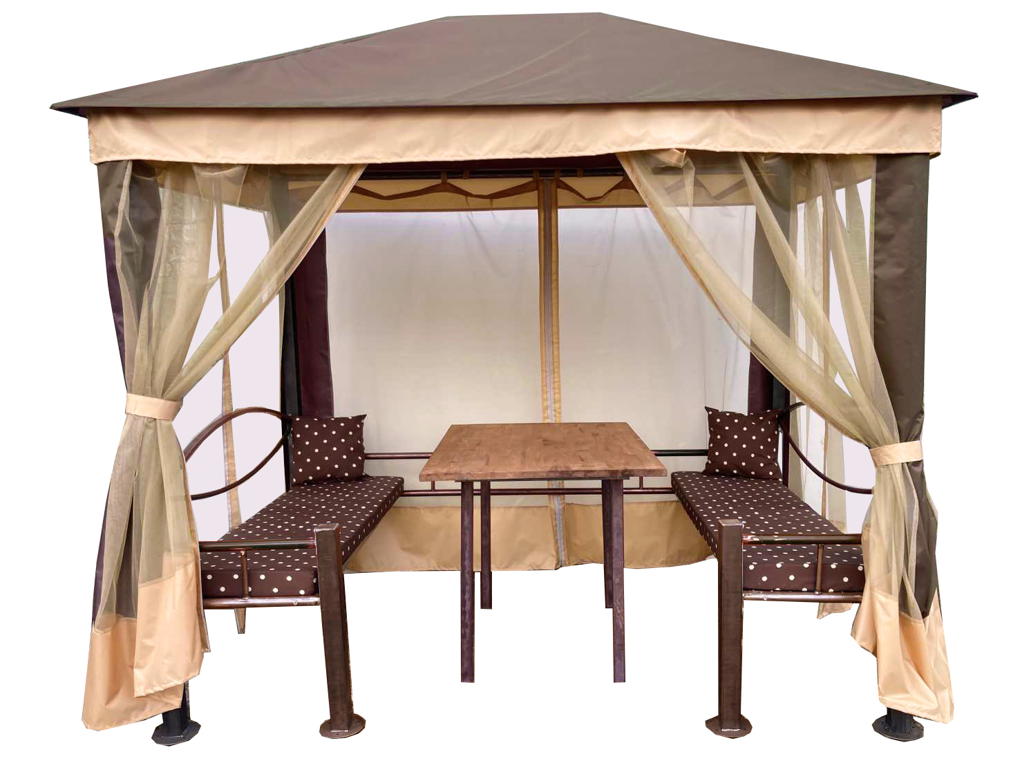 Шатер-беседка MebelSad Visit — идеальное решение для отдыха на даче или в саду. Надёжный стальной каркас, москитная сетка и мягкие сиденья обеспечат комфорт в любую погоду. Вмещает до 6 человек (до 500 кг). Размер сидений — 1500×450 мм, стол — 1200×800×800 мм. Матрасы толщиной 80 мм входят в комплект.